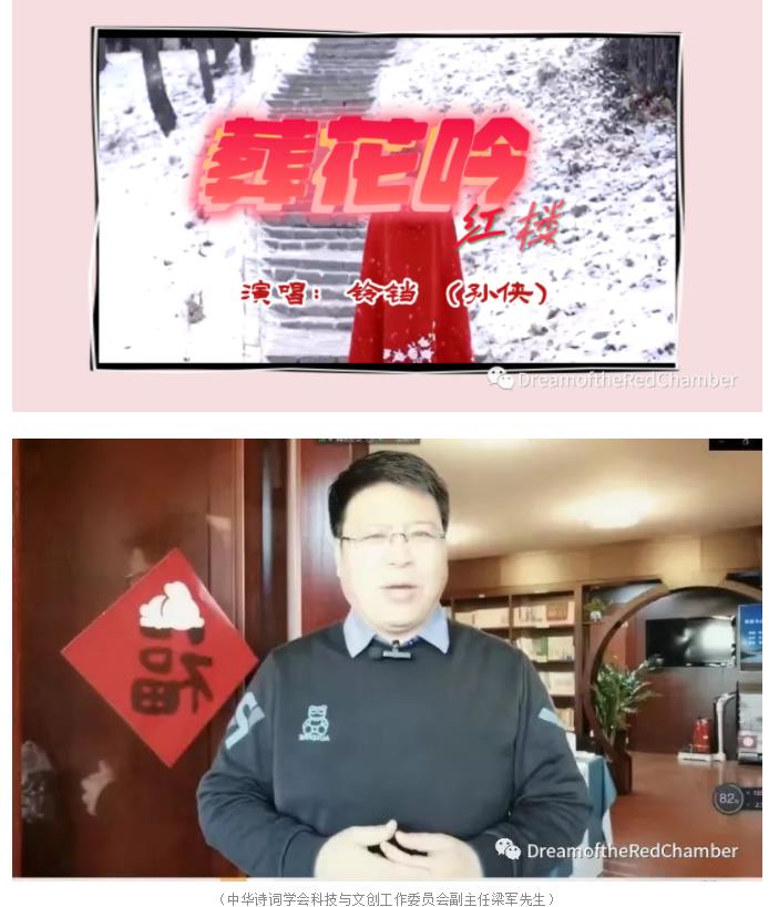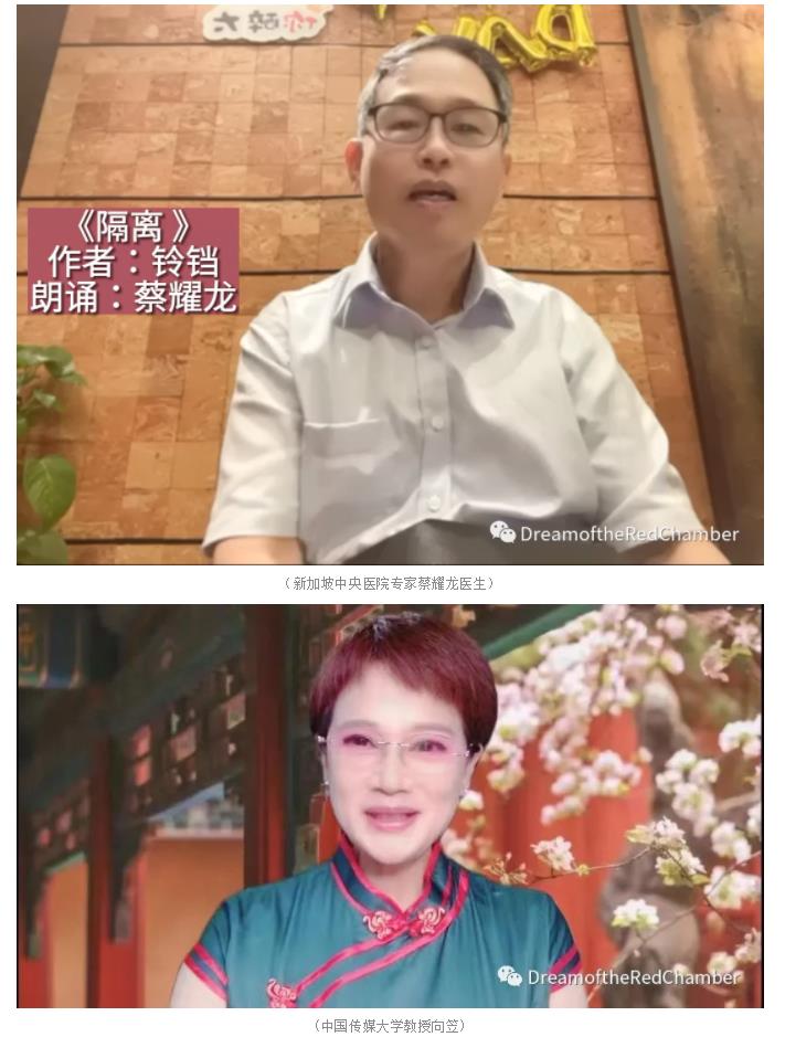第三篇章名家诗词吟诵,首先由新加坡投资家、红学家、作家王一先生朗诵自己对《红楼梦》的理解所创作的三首诗词,拉开序幕,中场时孙侠会长吟唱《葬花吟》,感人肺腑!其他如新加坡作家协会会长林得楠先生、中国艺术研究院红楼梦研究所所长孙伟科先生和中国红楼梦学会副秘书长石中琪、新加坡著名诗人陈志锐先生的原创诗词吟诵、周德成副会长、中华诗词学会闫志军副主任、台湾学者张玉明等20位学者、诗人、嘉宾也均分享了诗词吟诵,新加坡中央医院专家蔡耀龙医生用英语朗读了铃铛的原创诗《隔离》,著名朗诵艺术家张妙阳、郝知本先生也倾情献艺。